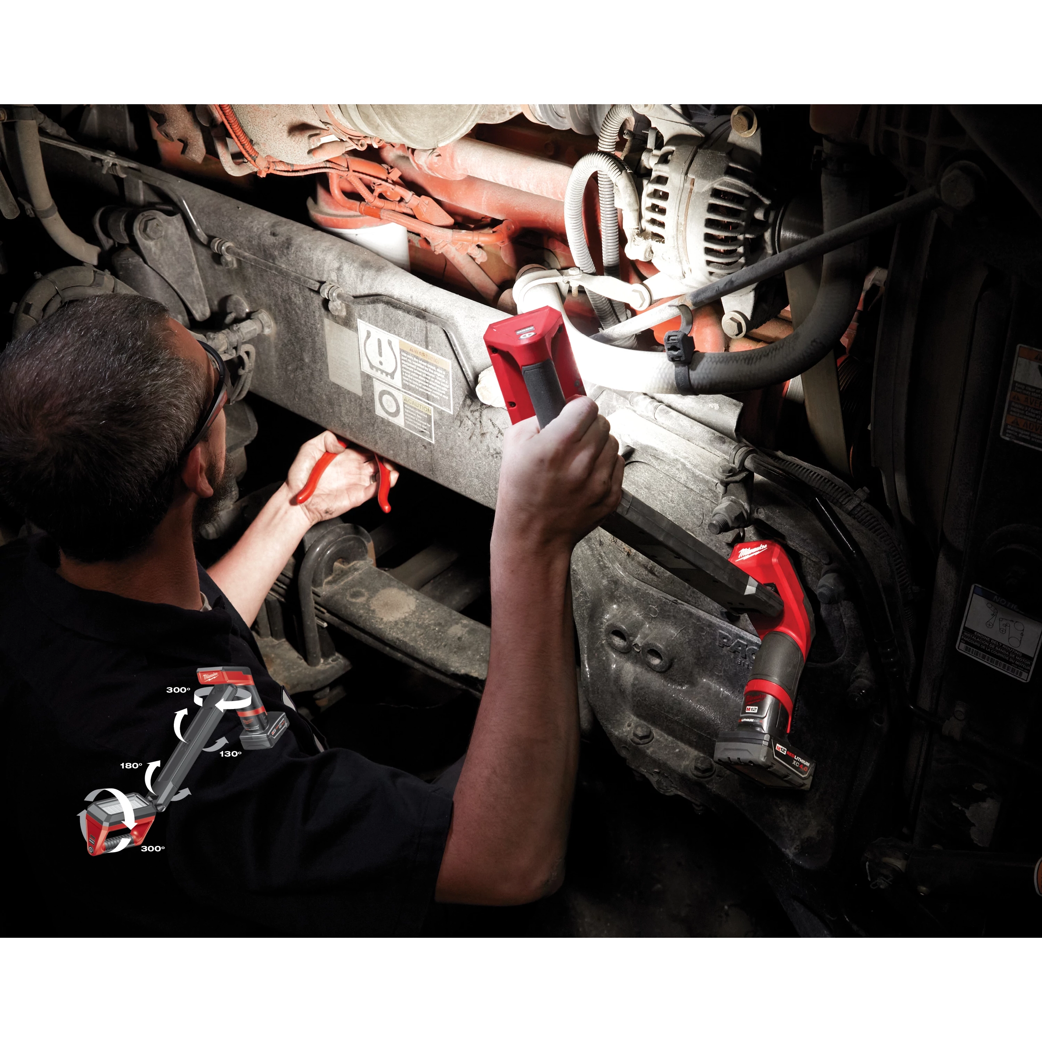 Our M12™ Underbody Light is the first of its kind, revolutionizing the way Automotive Mechanics execute underbody work. This innovative light delivers UNMATCHED MANEUVERABILITY & HANDS-FREE LIGHTING. Two swivel points with 300 degrees of horizontal rotation and up to 180 degrees of vertical rotation paired with a strong magnetic base allow for easy mounting and better positioning. This MILWAUKEE® M12™ light features a 12" magnetic storage tray to hold nuts and bolts. 1200 lumens of TRUEVIEW™ High-Definition Output gives you full coverage for all tasks under the vehicle. The M12™ Underbody Light can run up to 15 hours on low or 5 hours on high, providing all-day run-time on one XC4.0 Battery Pack. This LED underbody light is IP54 rated, impact, and corrosion-resistant to most chemicals found in the auto shop, guaranteed by a 5-year tool warranty. The high-quality LEDs never need to be replaced and are backed by a limited lifetime warranty.