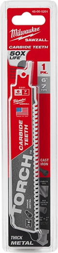 The TORCH™ with Carbide Teeth for Thick Metal SAWZALL® Blade cuts longer, cuts more and cuts faster. This carbide SAWZALL® blade is designed with Carbide Teeth for longer life vs. bi-metal blades in black iron, rebar, stainless steel, cast iron, and more. The 8 TPI design is ideal for fast, smooth cuts in thick metals.